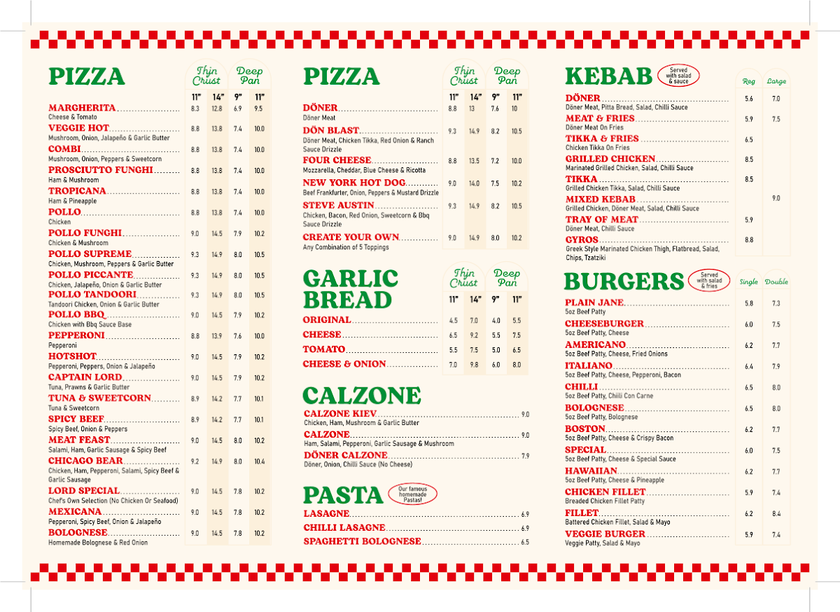 The menu at Lord Pizza offers a wide variety of options catering to different tastes and preferences. For pizza lovers, there are several choices, including the classic 9" Deep Margherita and 11" Deep Margherita, as well as the 11.5" Thin Margherita and 14" Thin Margherita, with each pizza providing a different size and style. For those seeking something more adventurous, options like the 9" Dp Vegi Hot bring a spicy twist. Garlic bread is also a staple, available in 09" Deep Garlic Bread and 11" Deep Garlic Bread, with the option to add cheese for an extra indulgence. The burger selection features options such as the 1/4lb Jane Burger and 1/2lb Jane Burger, alongside other variants like the 1/4lb Americano Burger and Double Americano Burger. Kebabs are offered in multiple styles, including the Large Donner Kebab in Pitta Bread and the Chicken Tikka and Fries for a lighter alternative. For a wrap, the Chicken Strips Wrap and Flaming Chicken Wrap stand out, with a perfect balance of flavors. The restaurant also serves Boneless Fried Chicken & Scampi, with items like the Kiev Special and Golden Chicken being popular choices. Those craving pasta can enjoy comforting dishes like Lasagne, Chilli Lasagne, and Spaghetti Bolognese. Side dishes like Garlic Mushrooms and Cheese and French Fries complement any meal, while dips such as Chilli Dip and Garlic Mayo Dip add a special touch. To satisfy your sweet tooth, indulge in desserts like Chocolate Fudge Cake or Salted Caramel Cheesecake. The drink menu includes popular choices like Coke Can and Pepsi Can, along with alcoholic options such as Red House Wine and Budweiser Beer. With its extensive menu, Lord Pizza ensures there is something for everyone, whether you’re in the mood for a hearty meal or a light snack.
